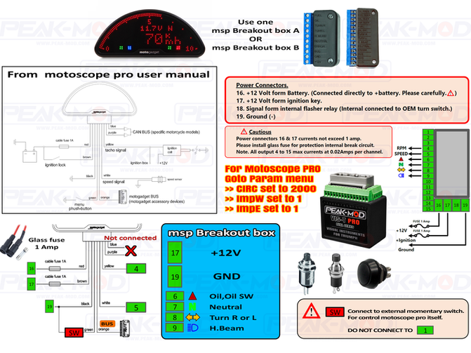 Speed / RPM digital pulse output. Oil pressure & neutral (-Gnd), Turn & high beam (+12v.)